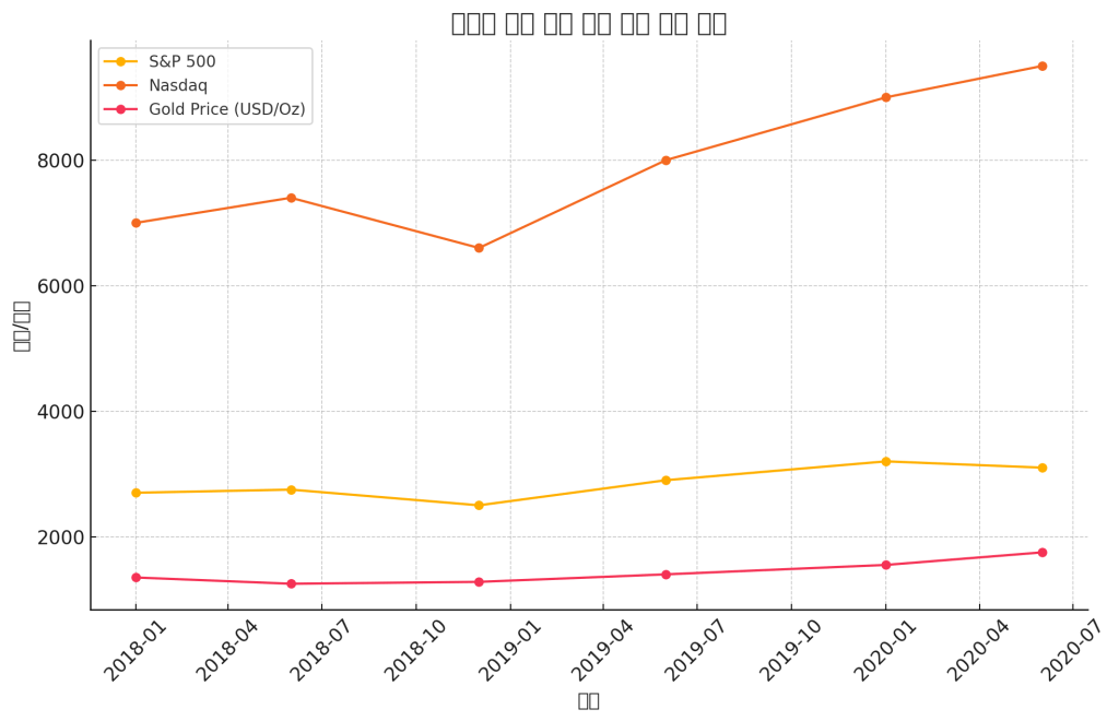 대표 자산인 S&P 500, 나스닥, 그리고 금값의 흐름을 비교해봤어요.