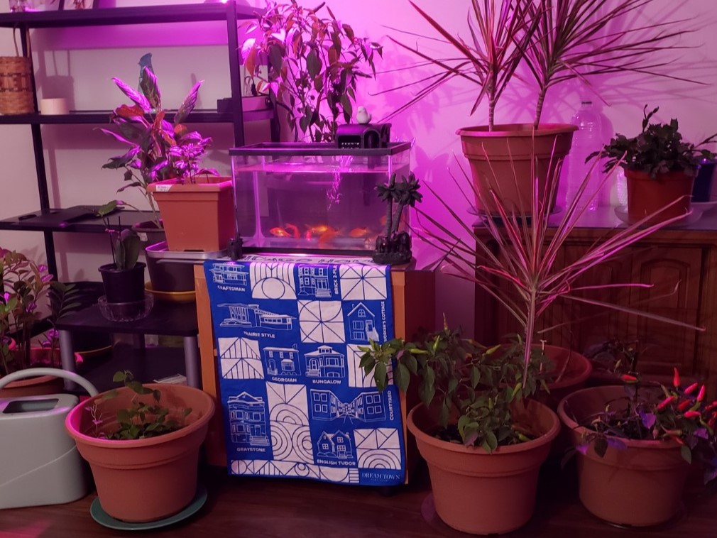 어항 속 물고기들, 그리고 잎사귀 사이로 번지는 LED 불빛—